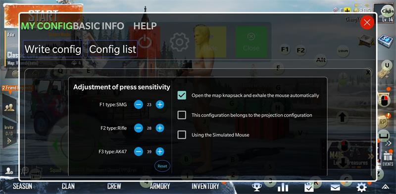Step 2 Enter the game such as PUBG, click“FPSDOCK”icon in the upper left corner, then click“Setting”icon. If it is the first time to run FPSDOCK APP in this game, please click“Write config”, then select the official config. At last, click“Close”icon to save the configuration and quit the setting.
